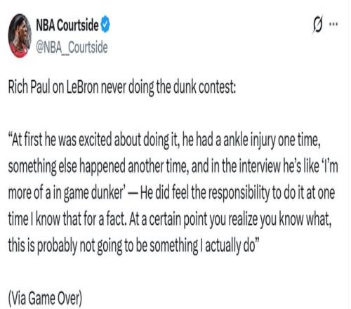 里奇-保罗在自己的《Game Over》播客节目中大胆断言,如果詹姆斯当年真的参加并赢下扣篮大赛,外界会是什么反应。“如果他赢了,人们只会说比赛是暗箱操作的。”保罗说道。