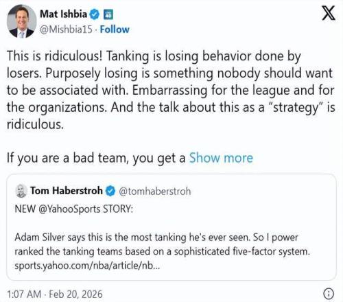 “这比任何投注丑闻都恶劣得多,”伊什比亚写道。“这是战略性故意输球。对花钱来看球、为球队加油的球迷来说太糟糕了,对所有真正在为季后赛席位拼搏的球队来说也同样不公平。”