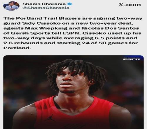 爆料王Shams:开拓者与双向合同后卫西迪-西索科,重新签约一份两年合同。
