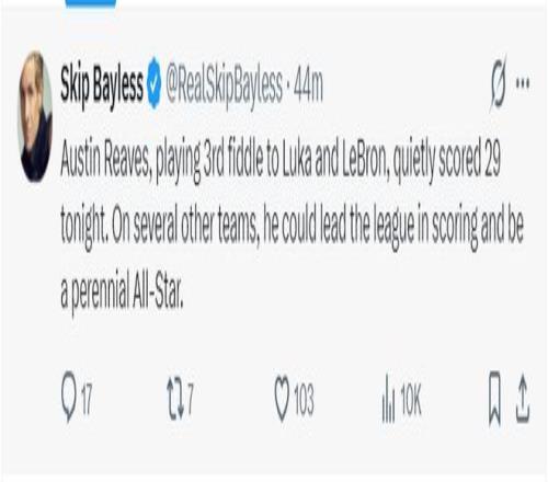 NBA名嘴斯利普-贝勒斯写道:在詹姆斯、东契奇的身边都能拿29分,如果他换一支球队他有机会拿到得分王,并且有希望常年进入全明星阵容。