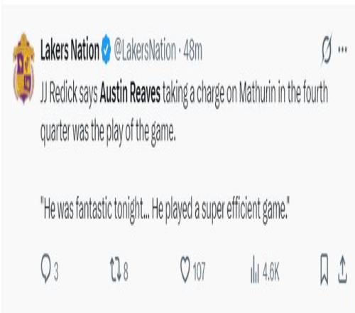 赛后雷迪克谈到里夫斯这场比赛的表现:里夫斯在末节制造马瑟林的进攻犯规堪称全场最佳表现。(马瑟林第六次犯规,泰伦卢挑战失败马瑟林被罚下场)他今晚的表现太出色了,他打出了非常高效的比赛。