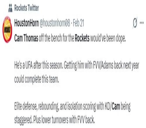 此前休媒还表示:如果托马斯能代表火箭替补登场那该有多棒啊,明年等到范弗利特、亚当斯回归这支火箭队就是攻防一体的球队。高效的防守、出色的篮板球,托马斯/杜兰特的单打能力,再加上范乔丹回归还能减少失误。