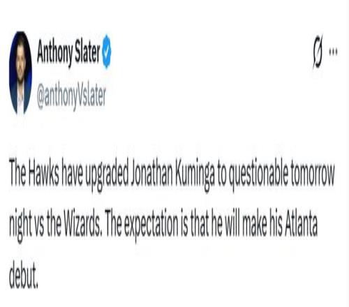 北京时间2月24日,据名记Slater报道,老鹰已将乔纳森-库明加明日对阵奇才的状态升级为出战成疑,预计他将在明日完成老鹰生涯首秀。