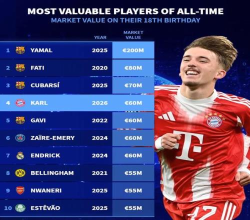 德转历史18岁球员生日当天身价榜:伦纳特卡尔6000万欧元第4