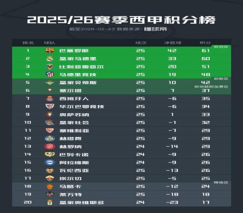 比利亚雷亚尔、马德里竞技分居积分榜第三、第四,目前身处欧冠区。皇家贝蒂斯排名第五处于欧联区。排名第六的塞尔塔领先西班牙人2分身处欧协联附加赛区。