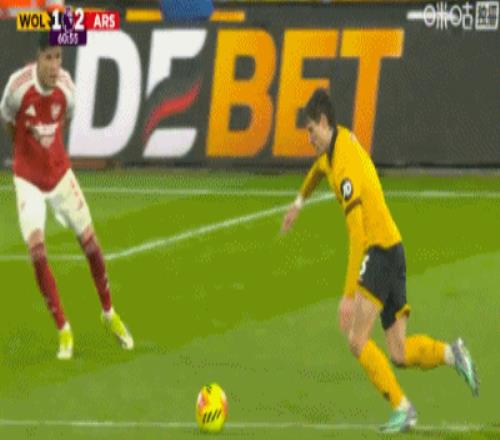 第90+3分钟,加布里埃尔和拉亚配合失误,卡拉菲奥里乌龙,狼队2-2阿森纳
