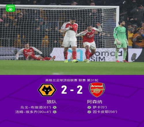 北京时间2月19日英格兰足球顶级联赛第31轮,狼队主场对阵阿森纳。上半场萨卡闪击,马丁内利造险,下半场因卡皮耶扩大比分,布埃诺扳回一球,卡拉菲奥里乌龙。最终比分狼队 2-2 阿森纳。