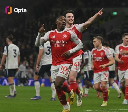 Opta统计,只有皮雷(7)和阿德巴约(6)在英超比赛中代表阿森纳对热刺时比埃泽(5)进球更多,埃泽的北伦敦德比联赛进球数已经追平了亨利和范佩西。