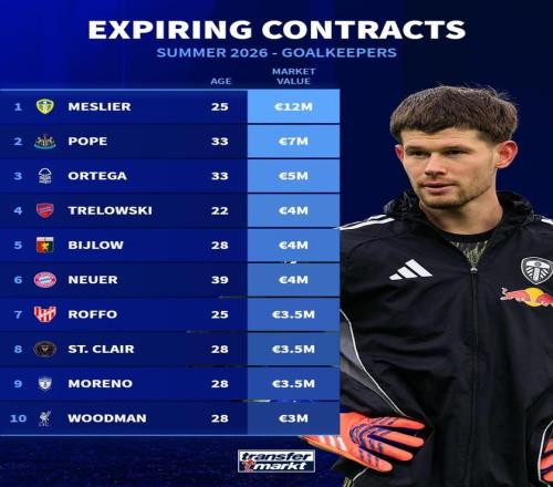 德国转会市场统计了今夏合同到期的十大门将,其中球员按照身价从高到低排序。德转列今夏合同到期的十大门将梅...
