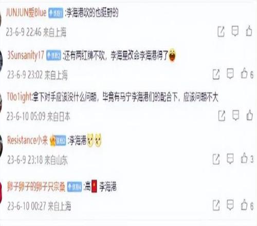 2023赛季6月上海海港在主场2比1击败南通支云的比赛中,当值主裁判李海新因多次偏袒主队而在赛后被球迷美其名曰:“李海港”(下图)。