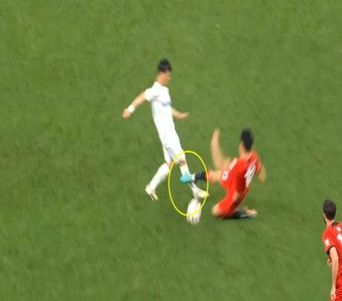 接着,魏震也在一次飞铲中踹到对手的小腿(下图),李海新照样没有任何表示,黄牌都没有。难道是李海新的执法风格宽松,少出牌?未必。