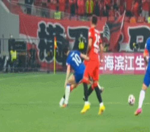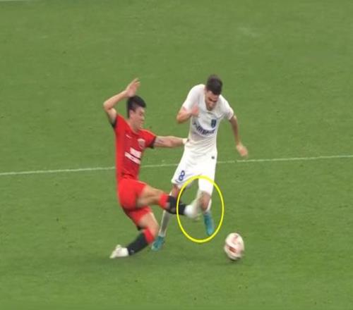 这场比赛中,海港球迷几次红牌铲球动作都逃过处罚。比如李帅在比赛中飞铲抬脚亮鞋钉踢到南通支云球员的膝盖(下图),李海新不仅没给红牌,连黄牌都没掏。